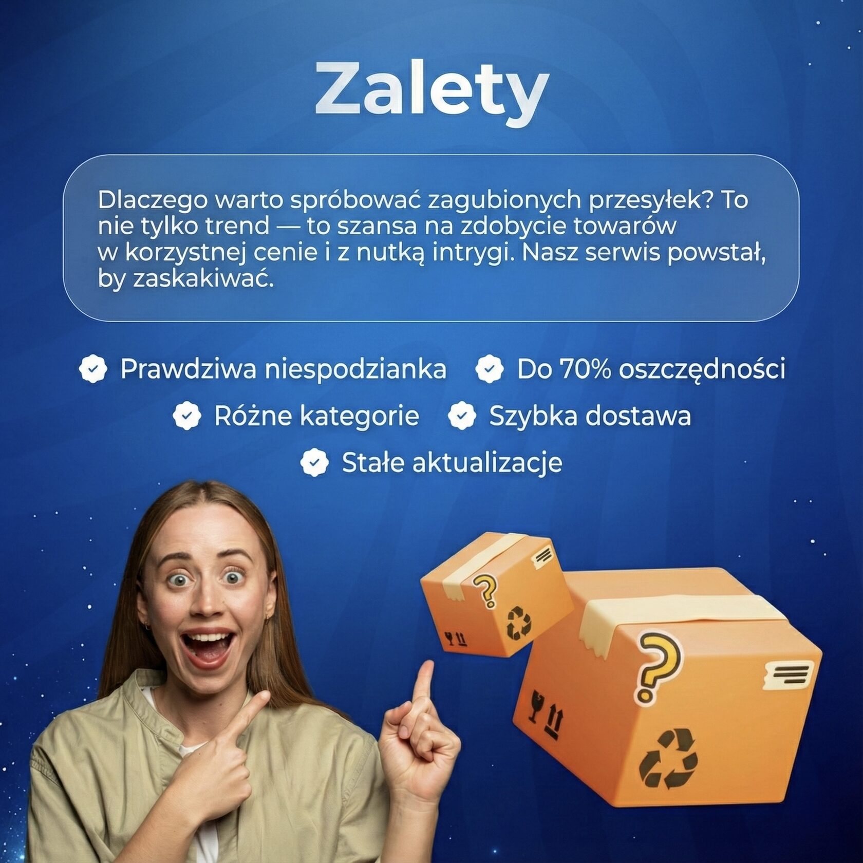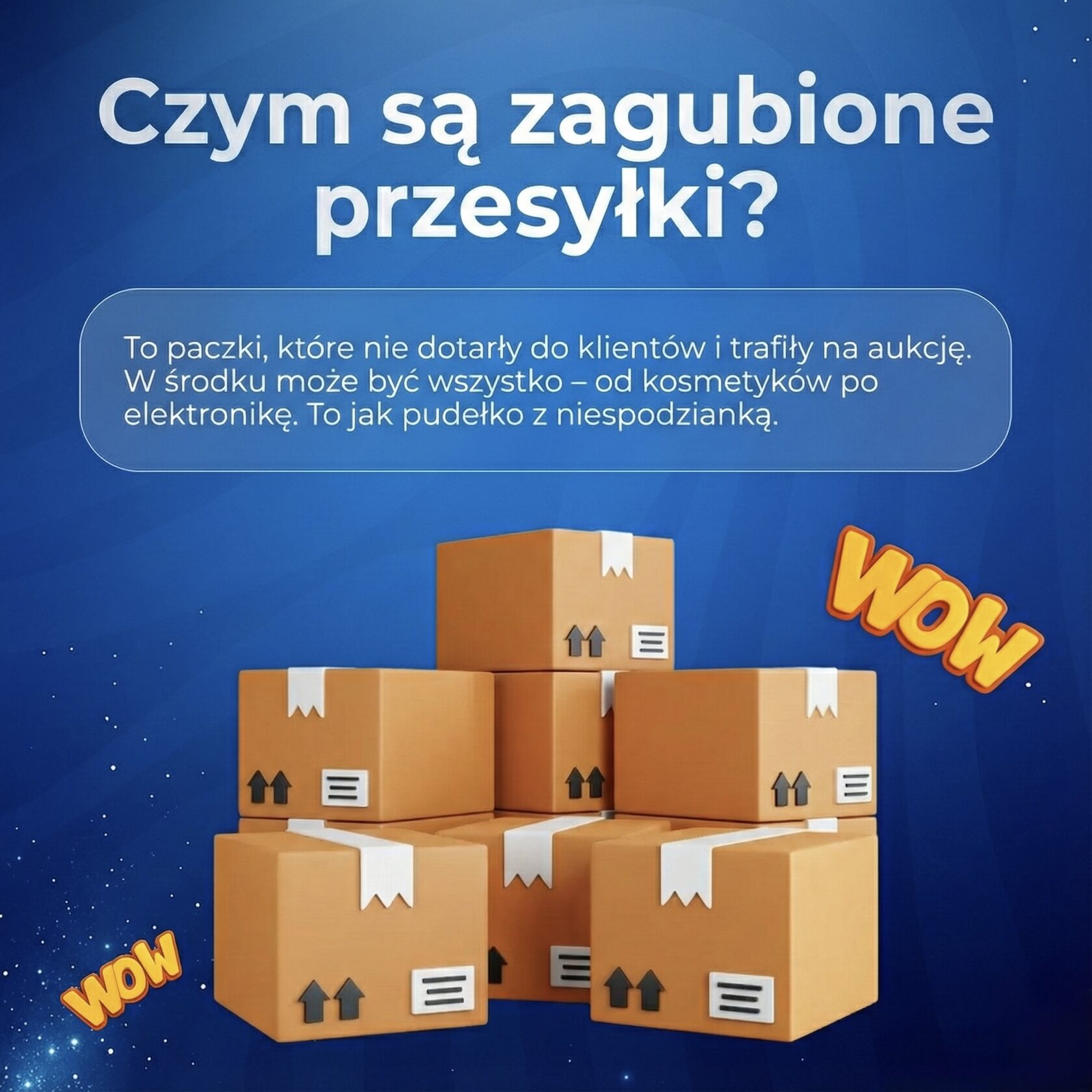 Każde pudełko to tajemnica: gadżety, kosmetyki, akcesoria i nieoczekiwane znaleziska. Wykupujemy nierozpakowane przesyłki z magazynów logistycznych i dajemy im drugie życie. Nigdy nie wiesz, co jest w środku — i właśnie w tym tkwi cała frajda!