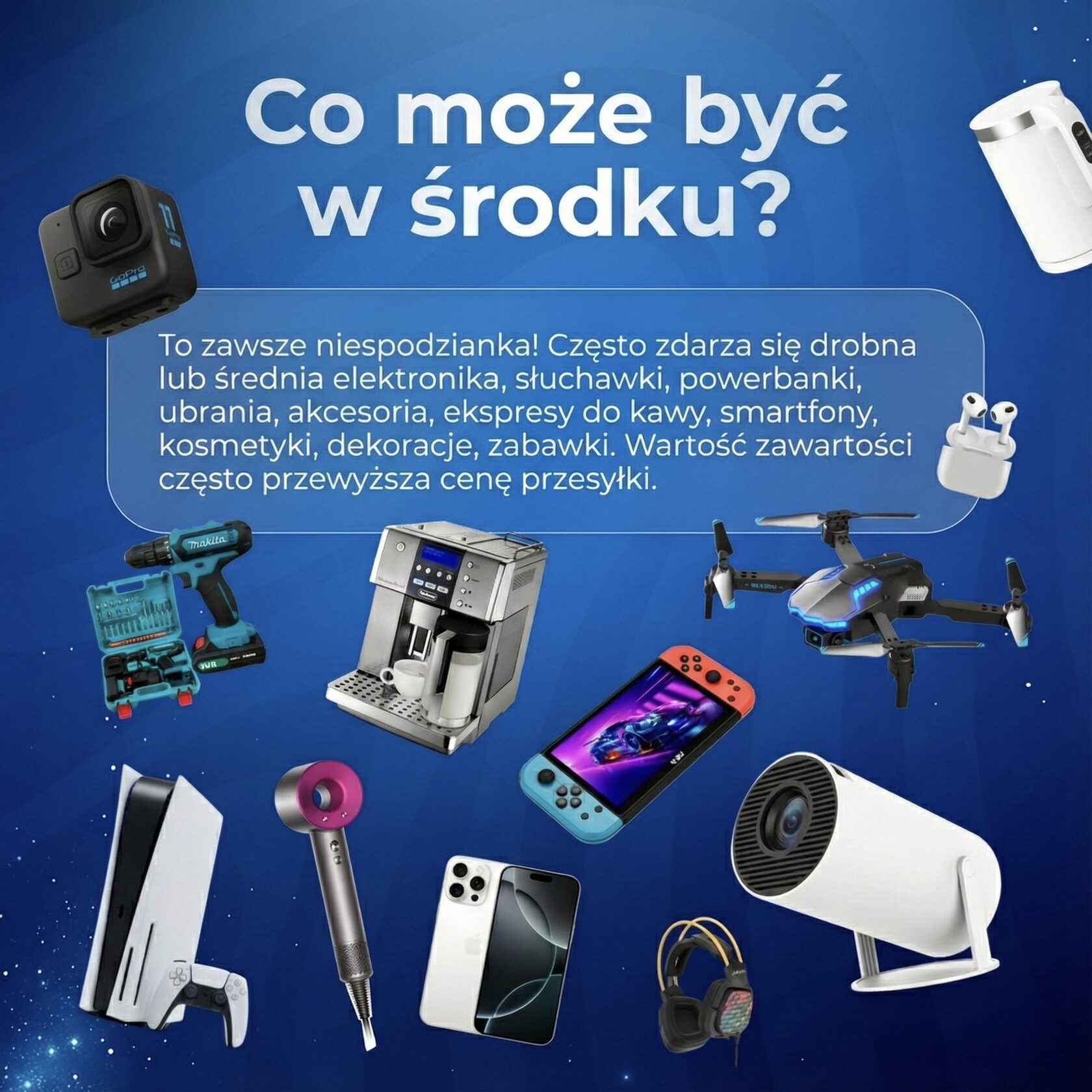 Są to przesyłki, które nie dotarły do odbiorców i trafiły na aukcję. W środku może być dosłownie wszystko — od kosmetyków po elektronikę. To prawdziwy surprise box.